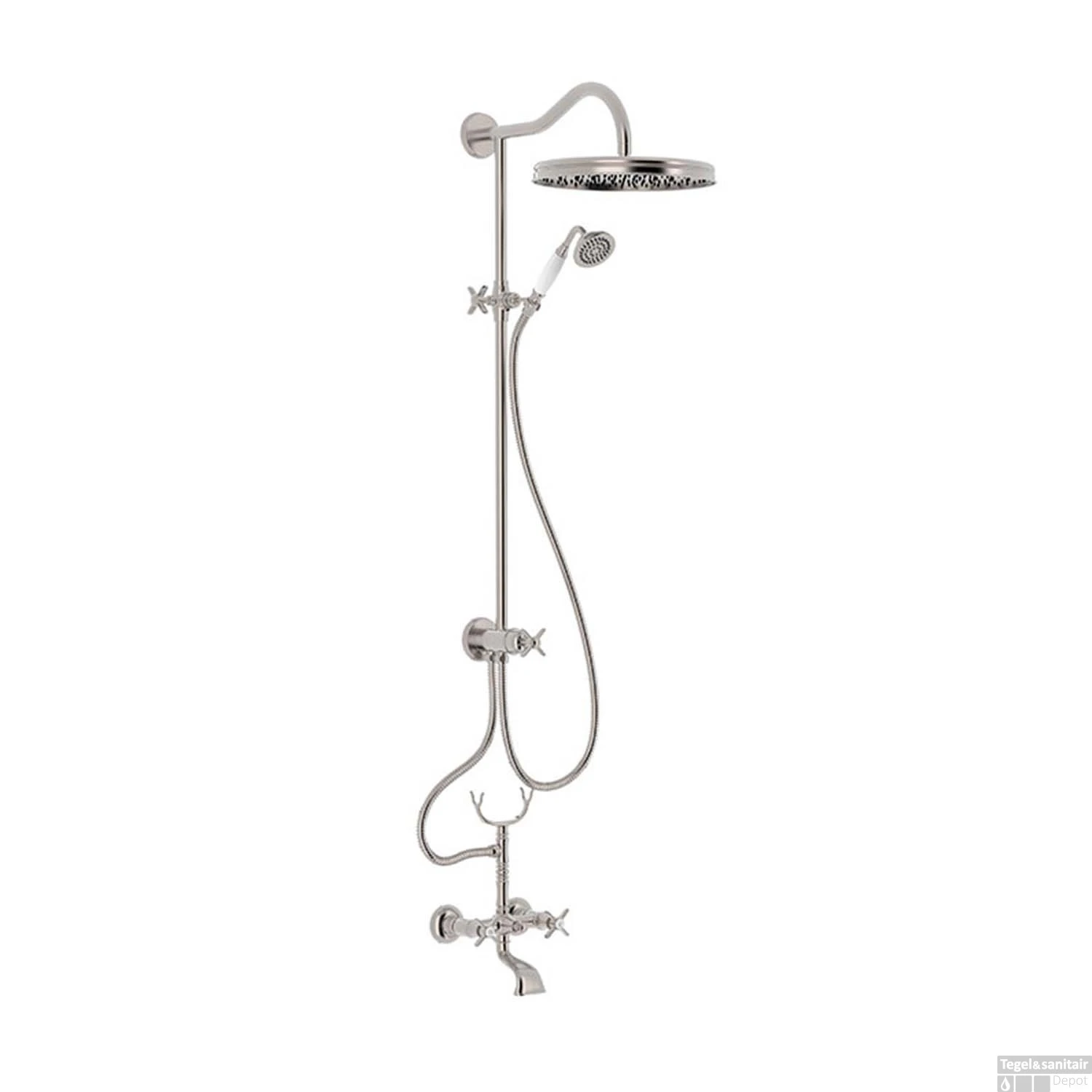 Deze bad/douche combinatie van Tres is een ideale oplossing voor een kleinere badkamer. Wilt u in uw badkamer een bad en douche maar heeft u eigenlijk niet zoveel ruimte? Dan kunt u kiezen om in uw bad te douchen. Deze set uit de Clasic collectie past perfect bij een klasieke badkamer. Door de gebogen vormen en witte accenten krijgt de douche een sierlijk uiterlijk. De set is compleet met hoofddouche, handdouche en badkraan. De hoofddouche heeft een diameter van 31 cm. De badkraan is te bedienen door twee kruisgrepen en de handdouche ligt op een sierlijke steun.