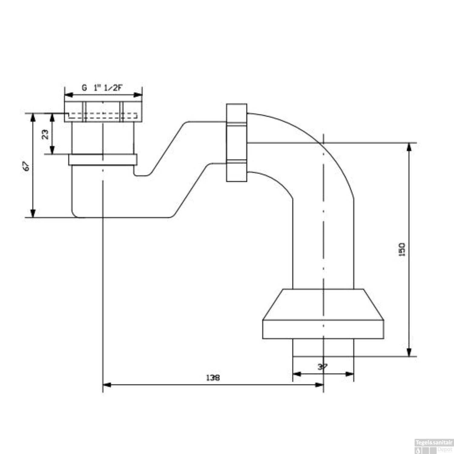 Deze badafvoer van het merk Sapho is inclusief sifon en wordt geleverd in een messing gouden kleur. De diameter van de waste is 52 mm, en de afvoer heeft een aansluiting van 1/2″ (zie ook technische tekening).