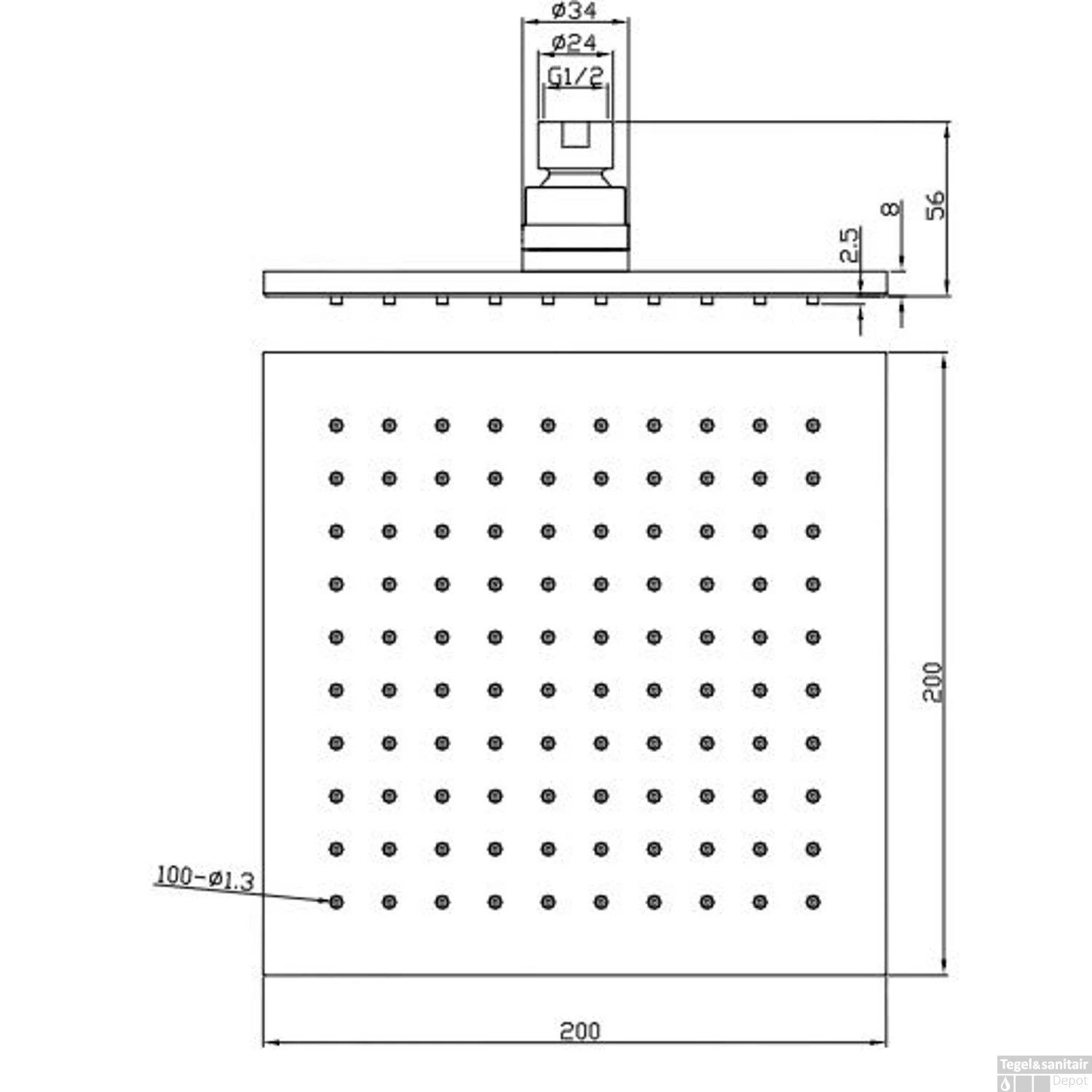 Specificaties BWS Hoofddouche Luxe Vierkant 20×20 cm Mat Zwart: