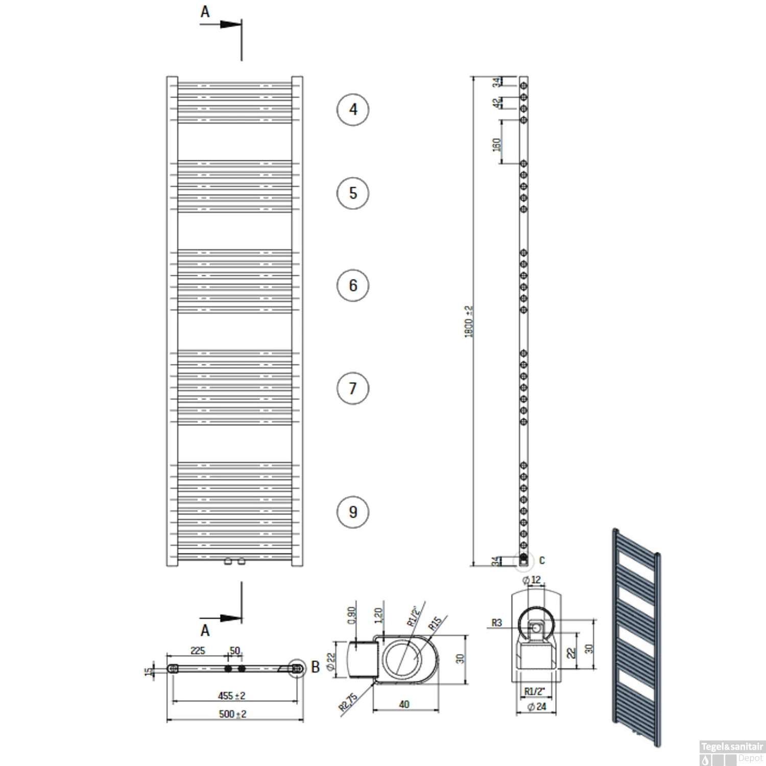 De radiator heeft een hoogte van 180 cm en een breedte van 50 cm. De radiator beschikt over een midden aansluiting. Wilt u weten hoeveel wattage u nodig heeft voor in uw badkamer? Er is een simpele rekensom die uit kunt gebruiken. Bereken eerst de inhoud (m3) van de ruimte. Vervolgens bepaalt u de gewenste temperatuur. Zie de afbeelding voor meer details.