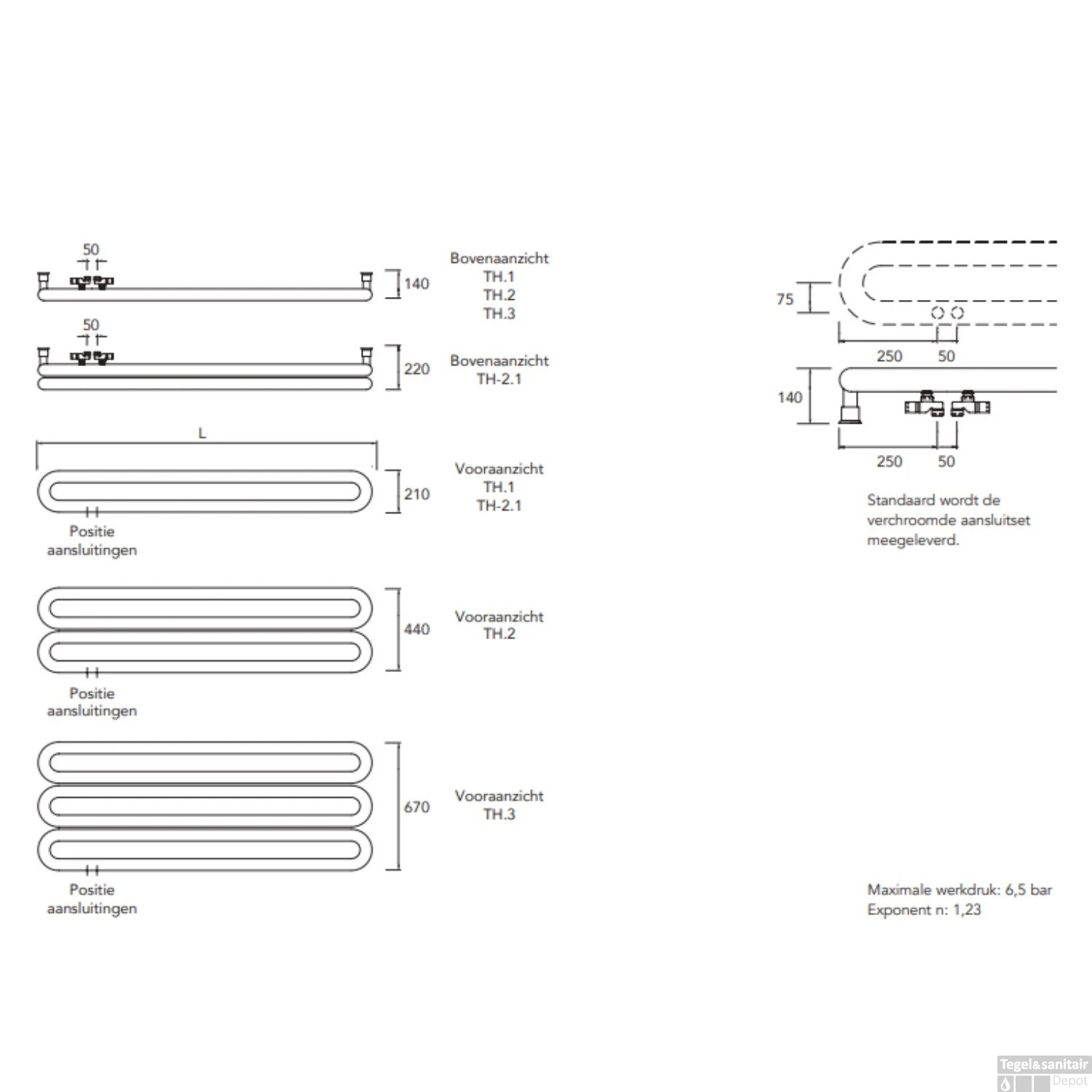 De designradiator bestaat uit een ronde buis in een ovalen vorm. De buis heeft een diameter van 60mm. De designradiator kan worden geleverd met één, twee of drie elementen boven elkaar, of twee elementen achter elkaar. De aansluitingen van de tubone bevinden zich achter de radiator en hebben een hart op hart maat van 100mm.