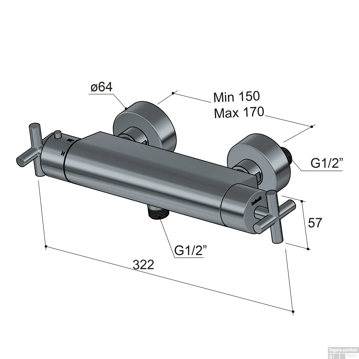 Specificaties Douchethermostaat Hotbath Chap Opbouw Onderaansluiting 2-kruisgreep Chroom: