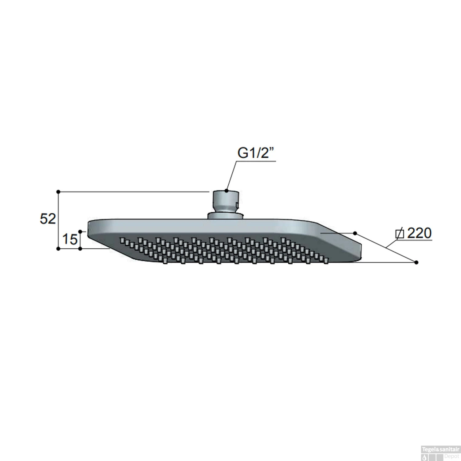 De hoofddouche is vierkant en is 22 bij 22 cm en is anderhalve cm dik. Let op dat er geen wandarm of plafonduitloop bij zit en dat apart besteld moet worden.