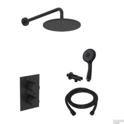 Deze inbouw regendoucheset wordt compleet geleverd met alle benodigde toebehoren. De elementen uit deze regendoucheset hebben een afwerking in de kleur mat zwart en zijn vervaardigd uit hoogwaardig messing. Hierdoor zijn de artikelen goed bestand tegen vocht en is een lange levensduur gegarandeerd. De set bestaat uit een inbouw thermostaatkraan, een wanduitloop, een doucheslang, handdouche, doucheaansluiting en hoofddouche. De handdouche is voorzien van drie sproeistanden die u naar wens kunt instellen.