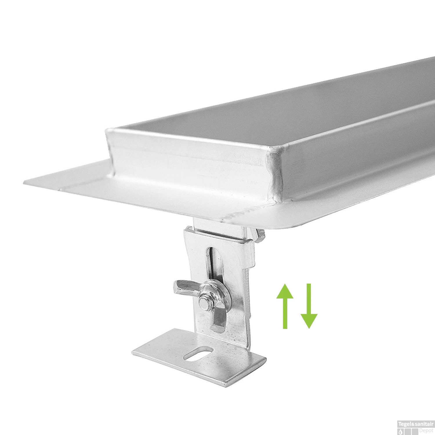De slanke goot van 100 cm is volledig gemaakt van RVS.