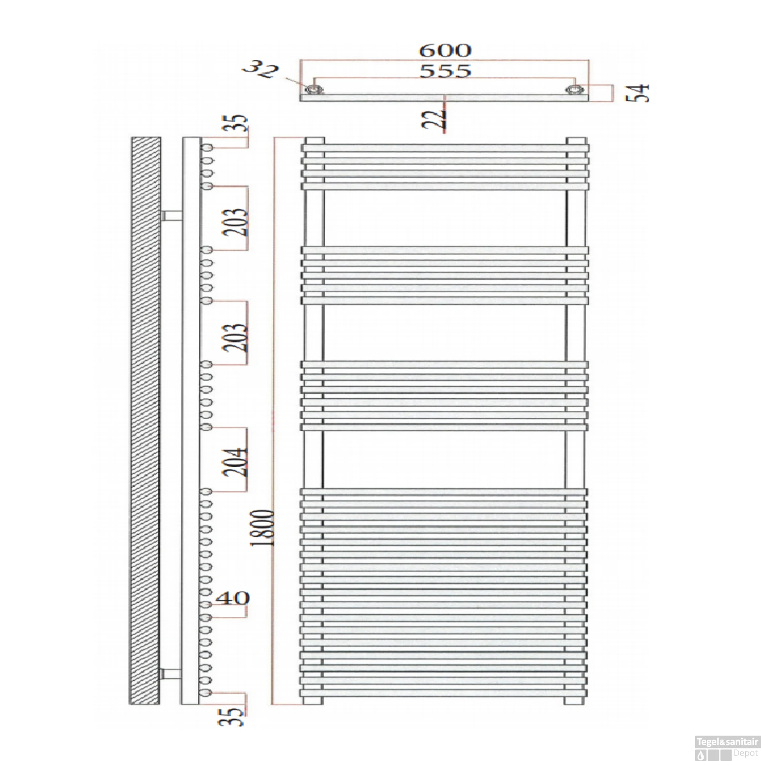 De radiator heeft een hoogte van 180 cm en een breedte van 60 cm en is zodoende perfect voor elke badkamer! De radiator is aan de onder- of bovenzijde aan te sluiten. Bovendien vindt u een afsluiter en een ontluchter voor de aansluitpunten die niet gebruikt zullen worden en worden er vier montagebeugels meegeleverd. De hart-op-hart afstand bedraagt 55,5 cm.