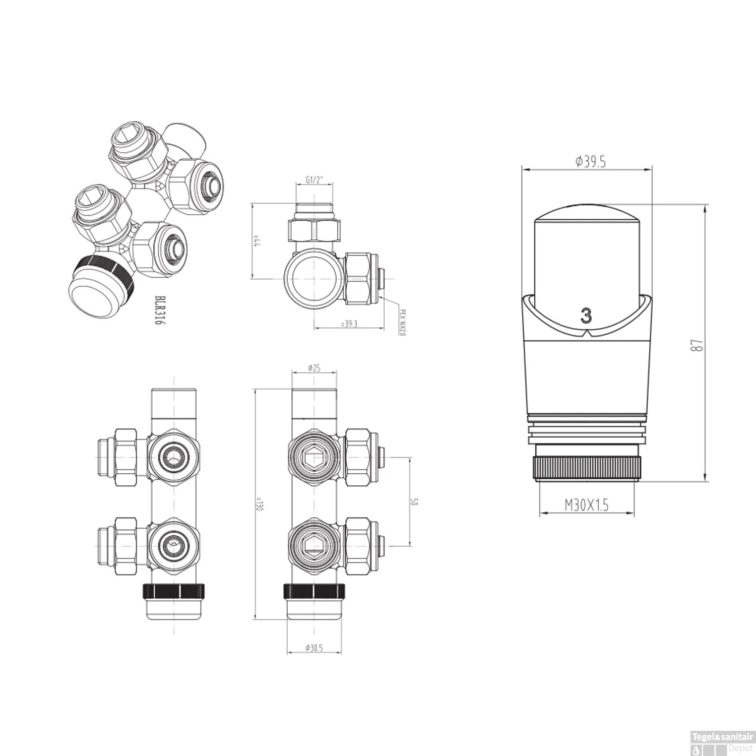 De set komt met een haaks onderblok, een thermostaat knop en twee verloopringen met een schroefdraad van 3/4 inch naar 1/2 inch.