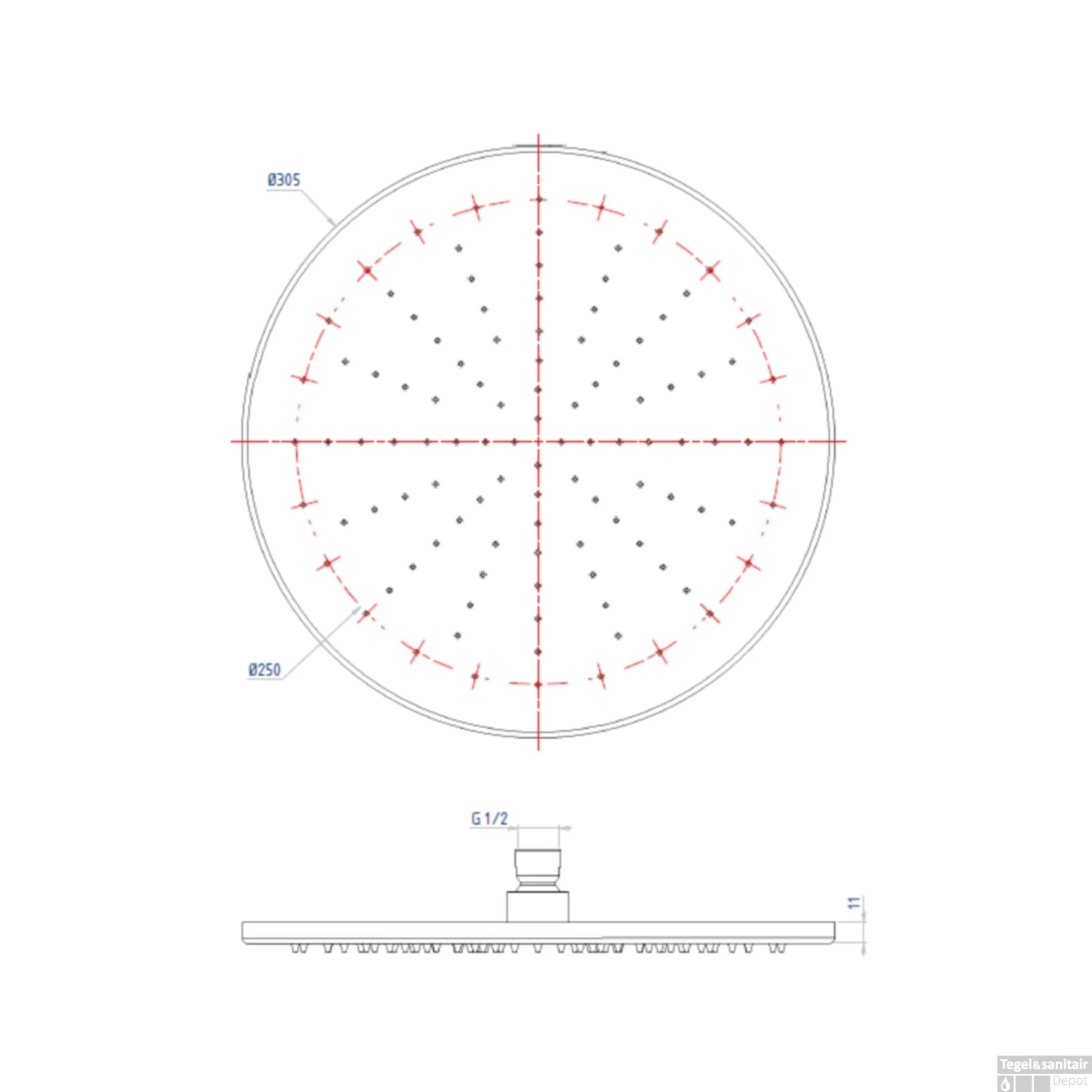 De douchekop heeft een diameter van maar liefst 30.5 cm. De spuitgaten strekken over een oppervlakte van 25 cm in diameter. De kop is 1.1 cm dik.