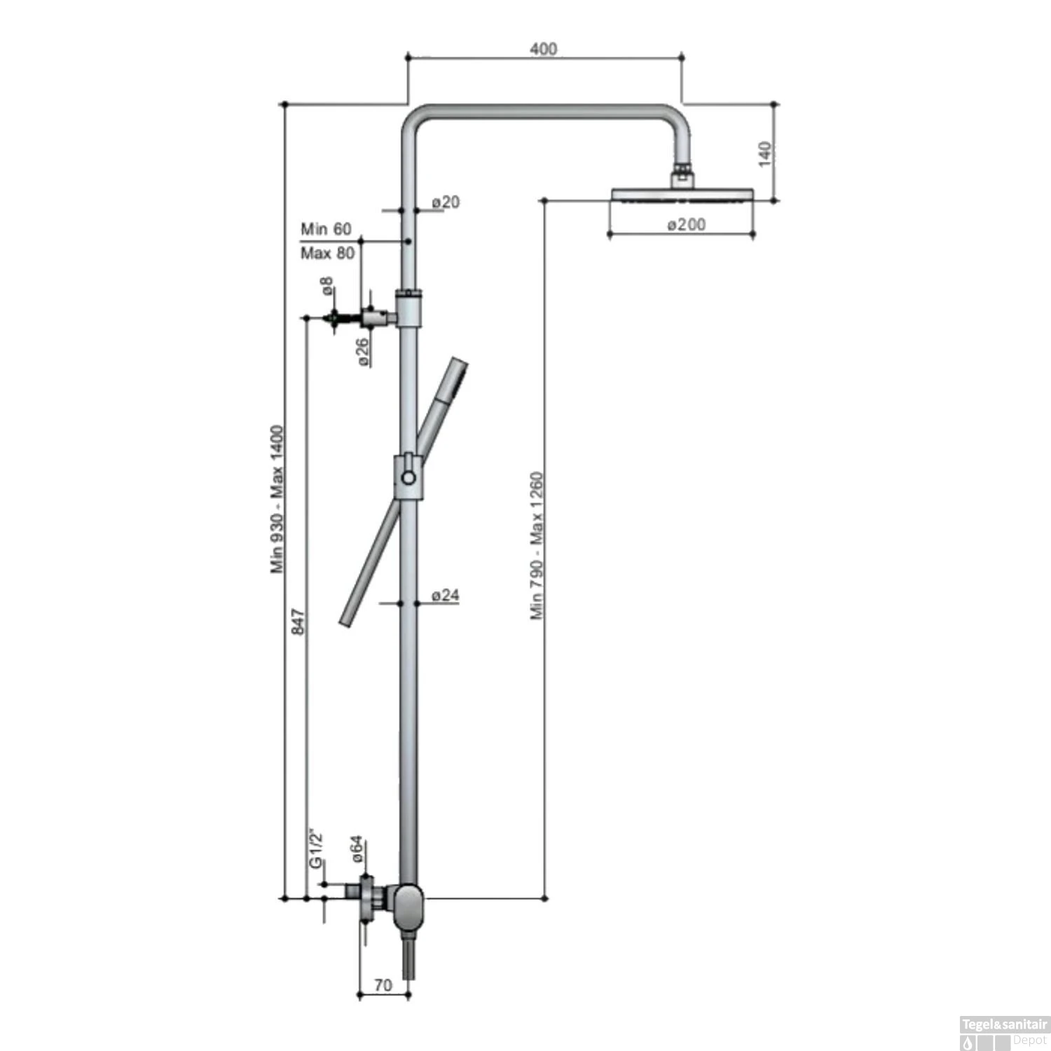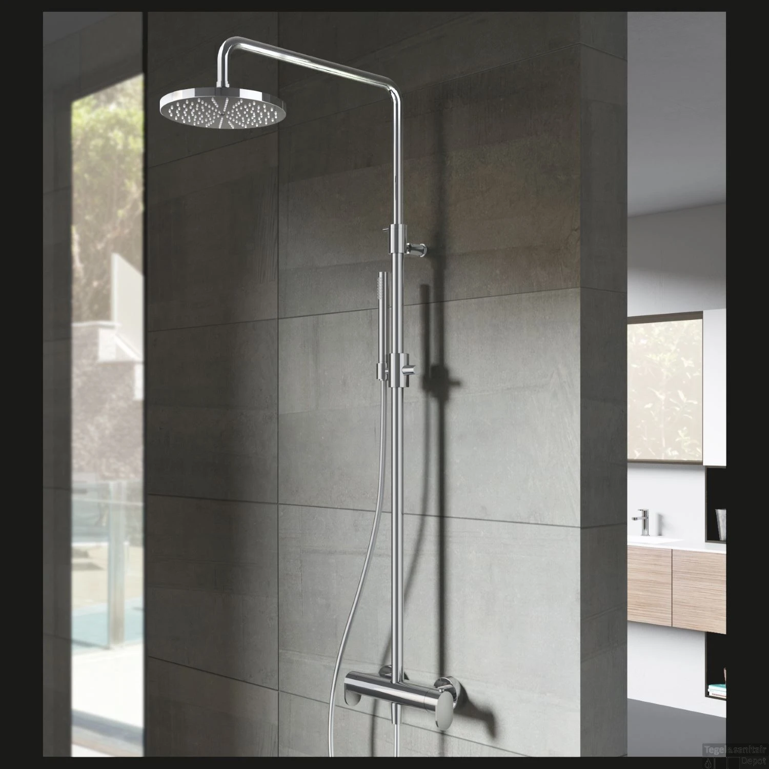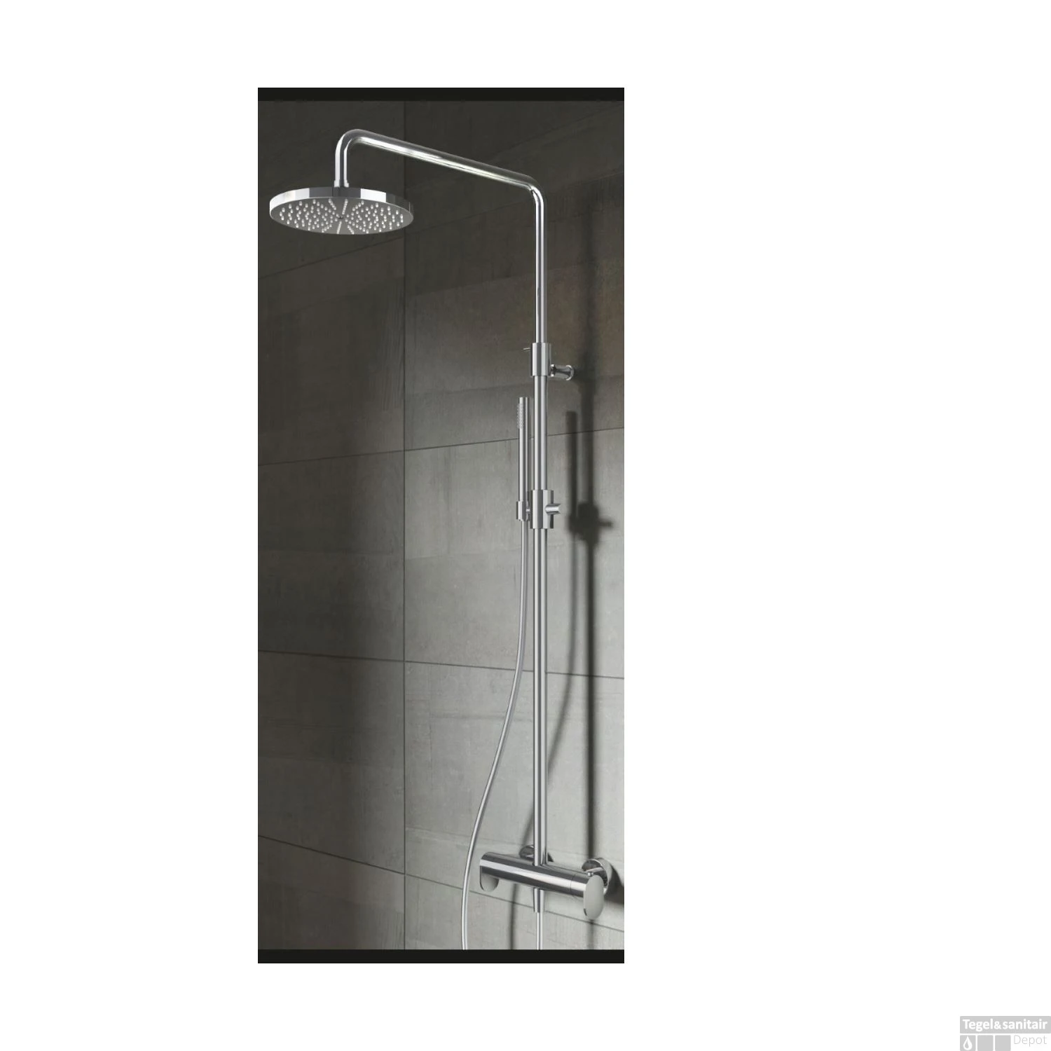 De hoofddouche is rond en heeft een diameter van 20 centimeter. Een perfecte grote om u van schouder tot schouder te voorzien van water. De stortdouche heeft een kogelmechanisme waarmee u de kop kunt draaien. De uitloop is 40 cm en niet te verstellen. Wel kunt u de hals van de hoofddouche draaien. De afstand van de hoofddouche kan variëren in hoogte van de thermostaat van 79 t/m 126 cm. Daarmee kunt u zelf de gewenste hoogte instellen.