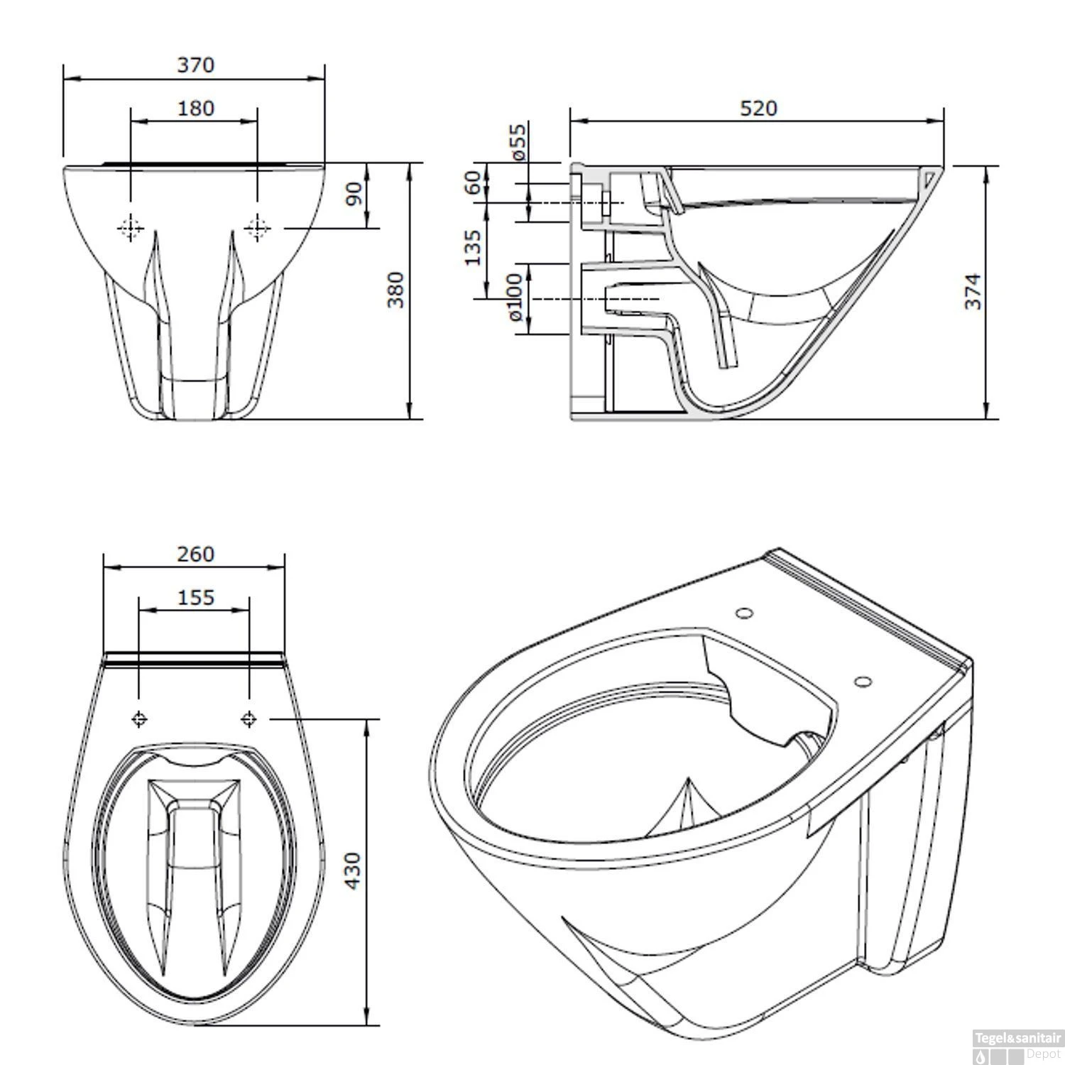 Het toilet is 38 cm hoog, 37 cm breed en 52 cm diep. Hij is van keramiek in de kleur wit. Dit wandcloset wordt geleverd exclusief zitting. Deze kunt u los erbij bestellen.